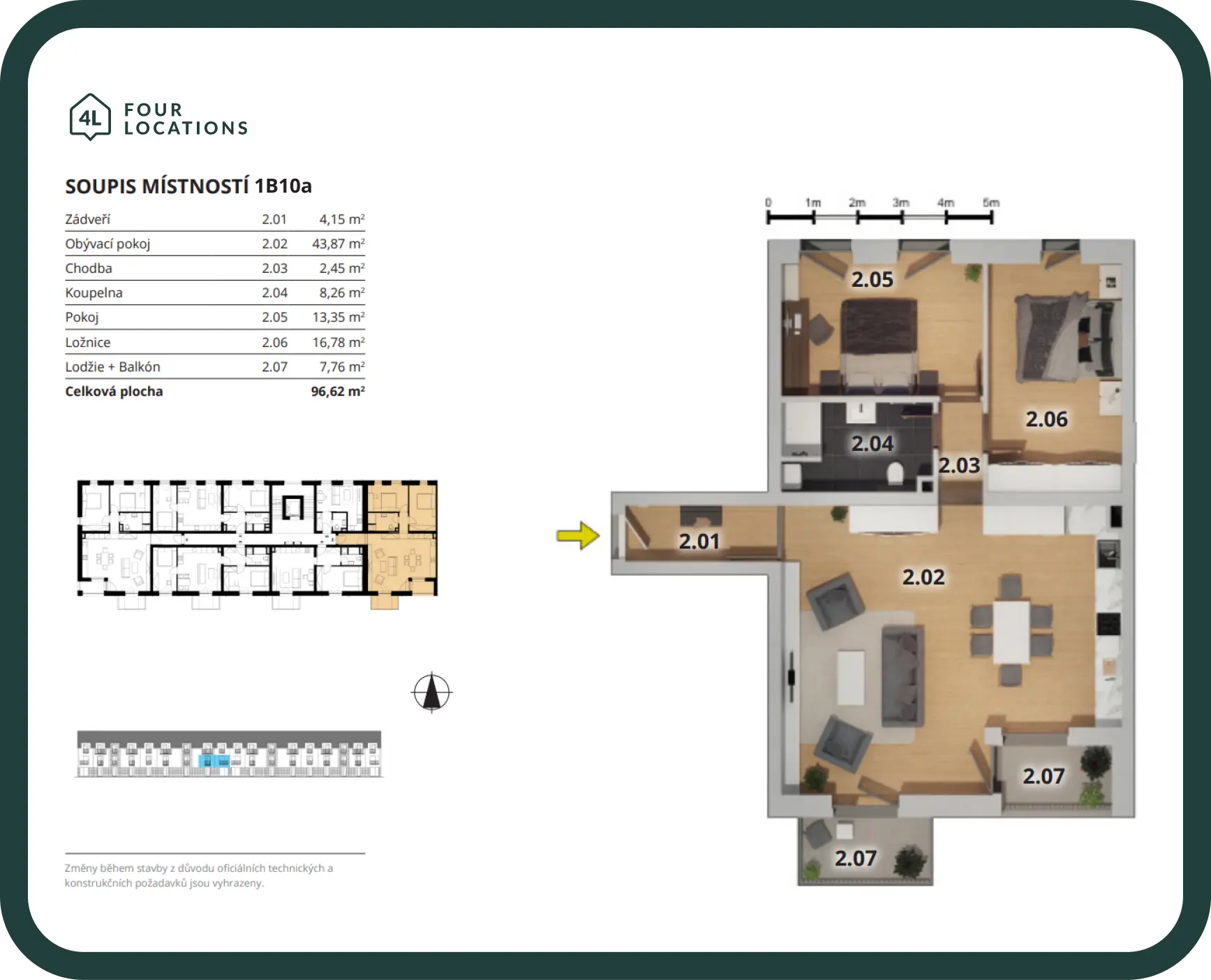 Byt 1B10a má balkon o velikosti 7,76 m2.