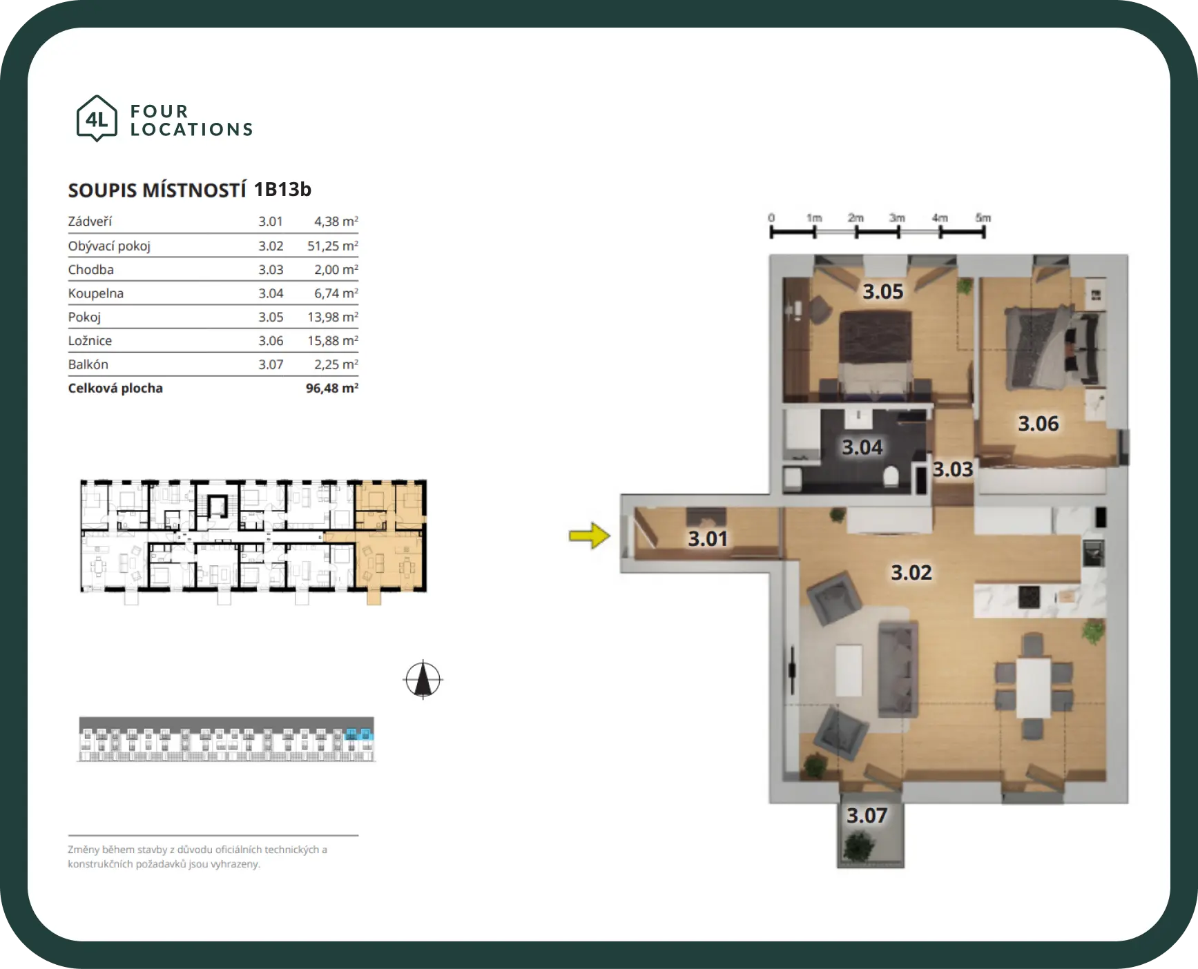 Byt 1B13b má balkon o velikosti 2,25 m2.