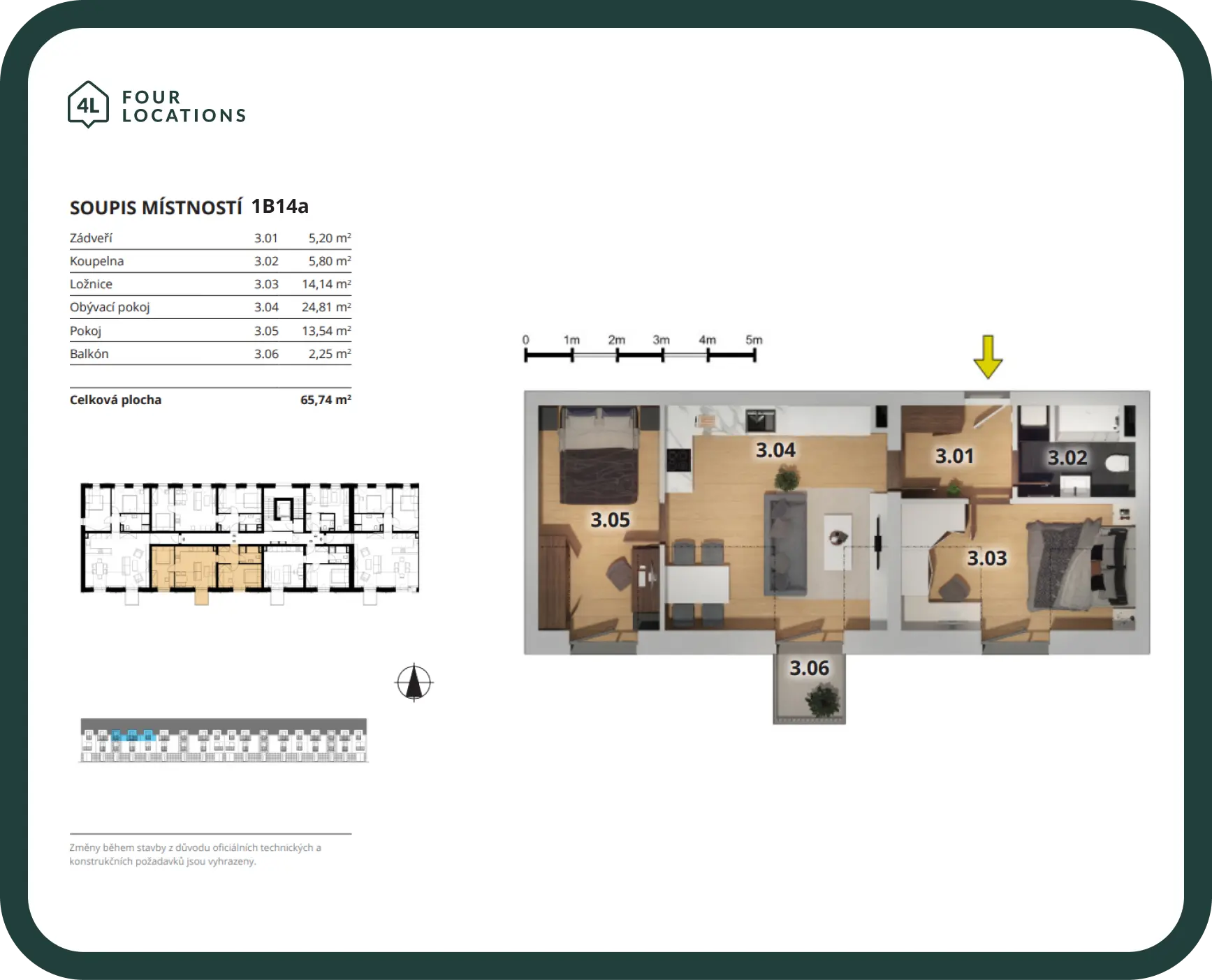 Byt 1B14a má balkon o velikosti 2,25 m2.