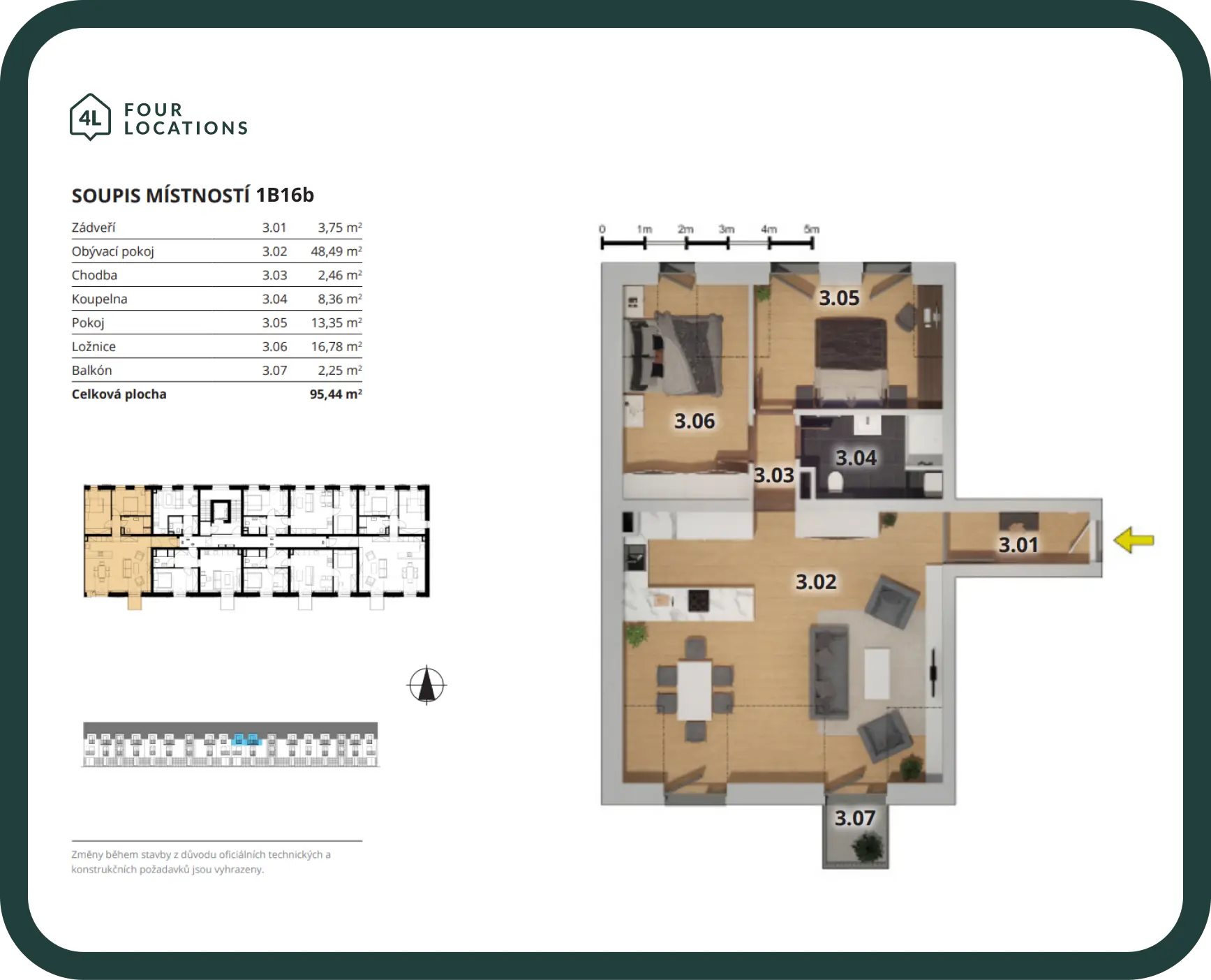 Byt 1B16b má balkon o velikosti 2,25 m2.