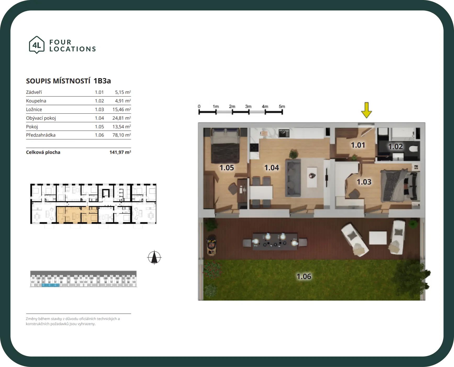 Byt 1B3a má předzahrádku o velikosti 78,70 m2.