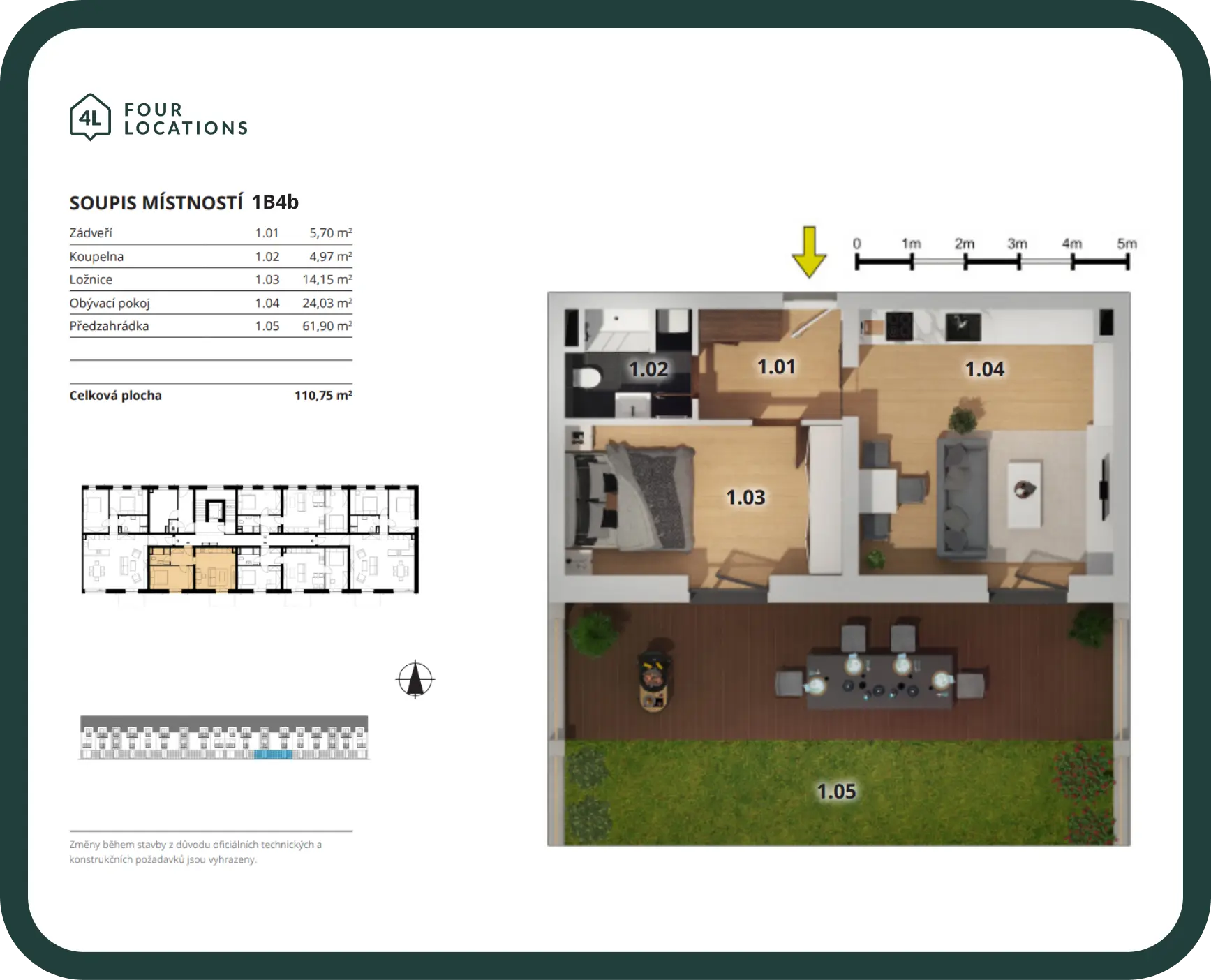 Byt 1B4b má předzahrádku o velikosti 90,3 m2.