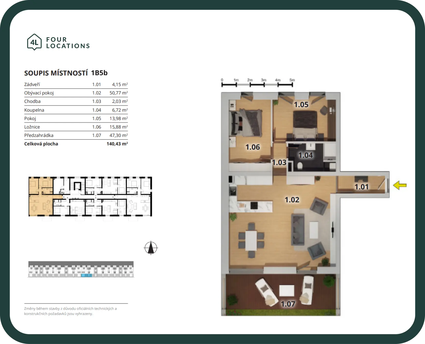 Byt 1B5b má předzahrádku o velikosti 50,60 m2.