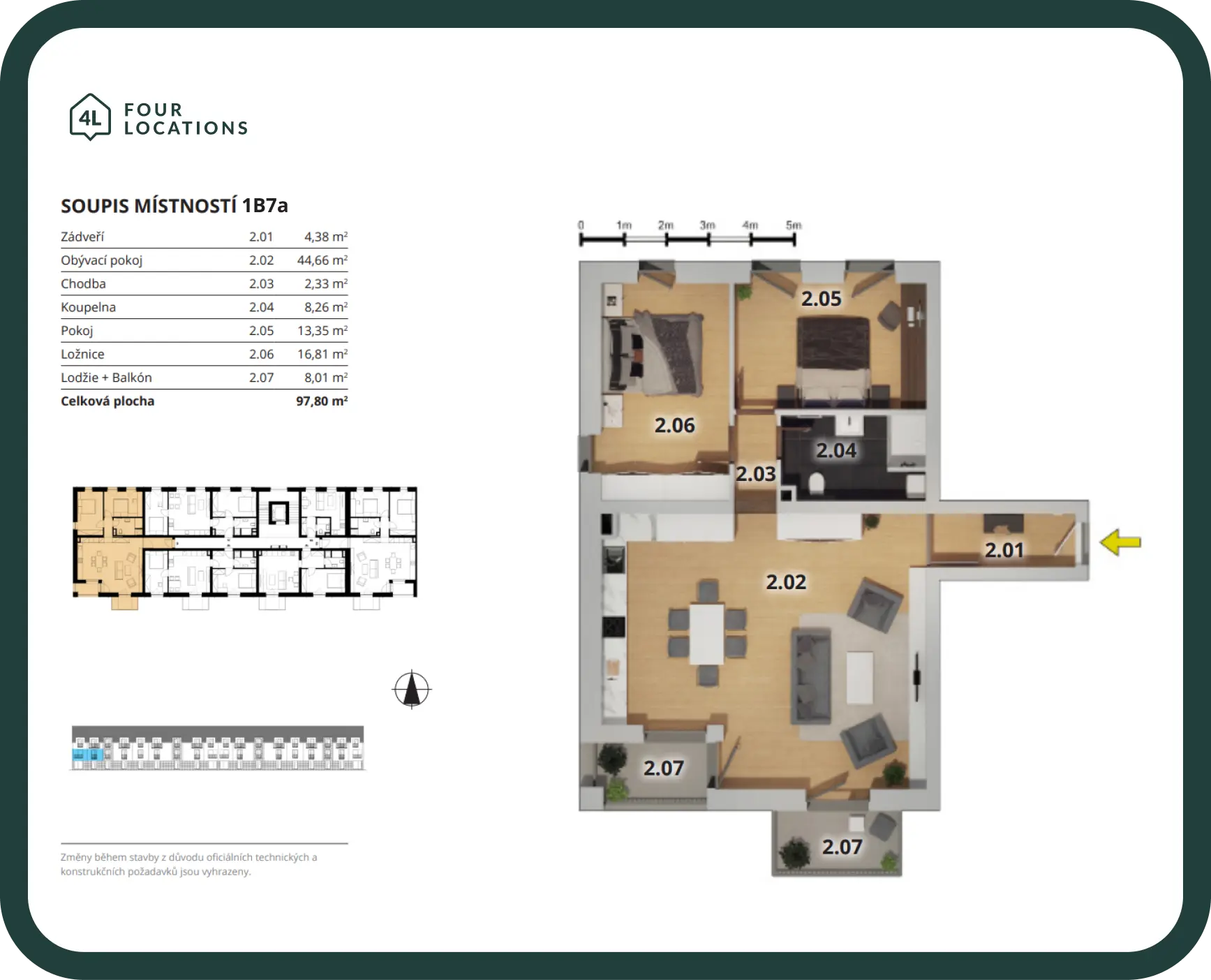Byt 1B7a má balkon o velikosti 8,01 m2.
