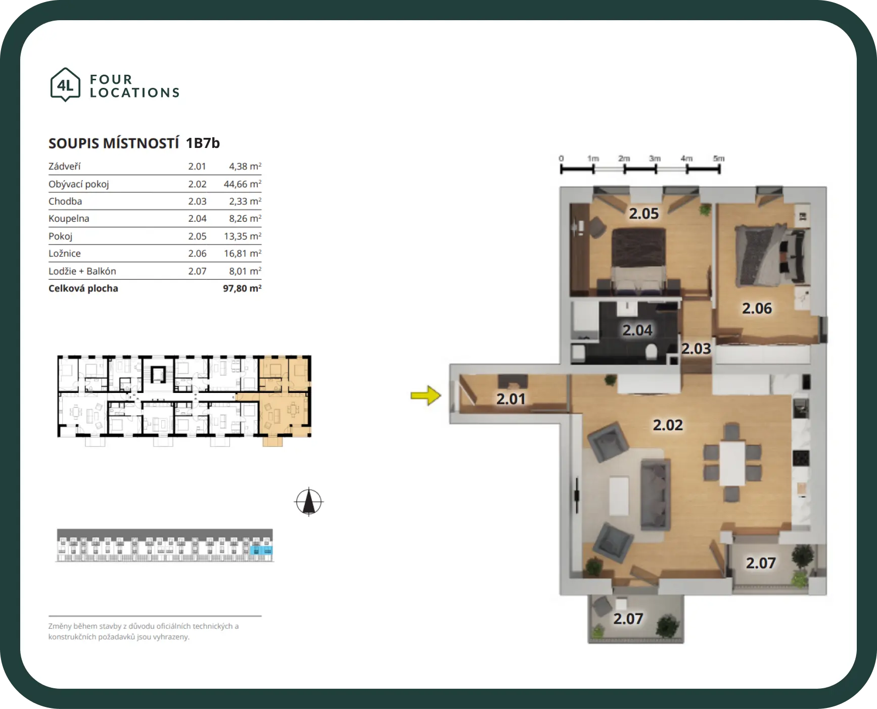 Byt 1B7b má balkon o velikosti 8,01 m2.