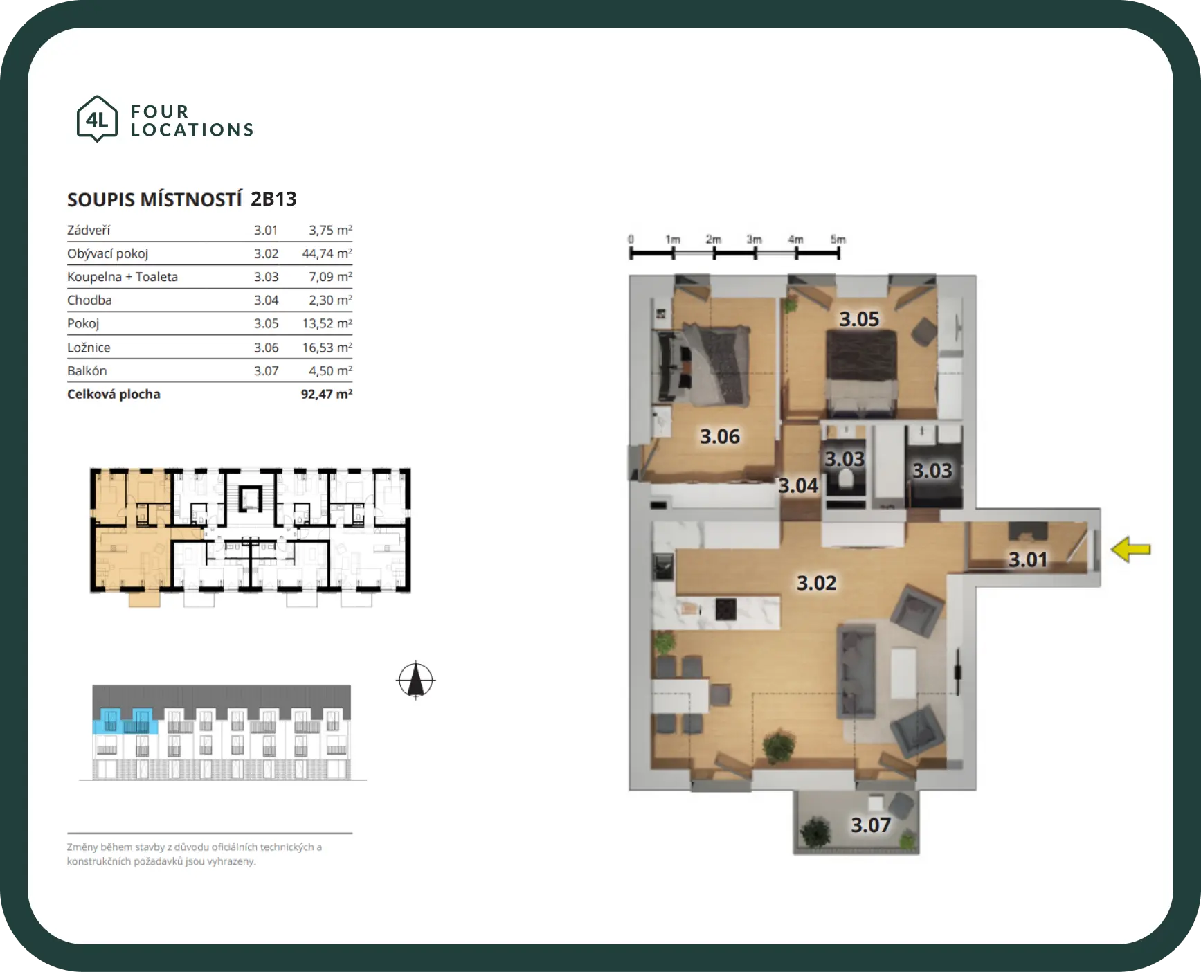 Byt 2B13 má balkon o velikosti 4,5 m2.