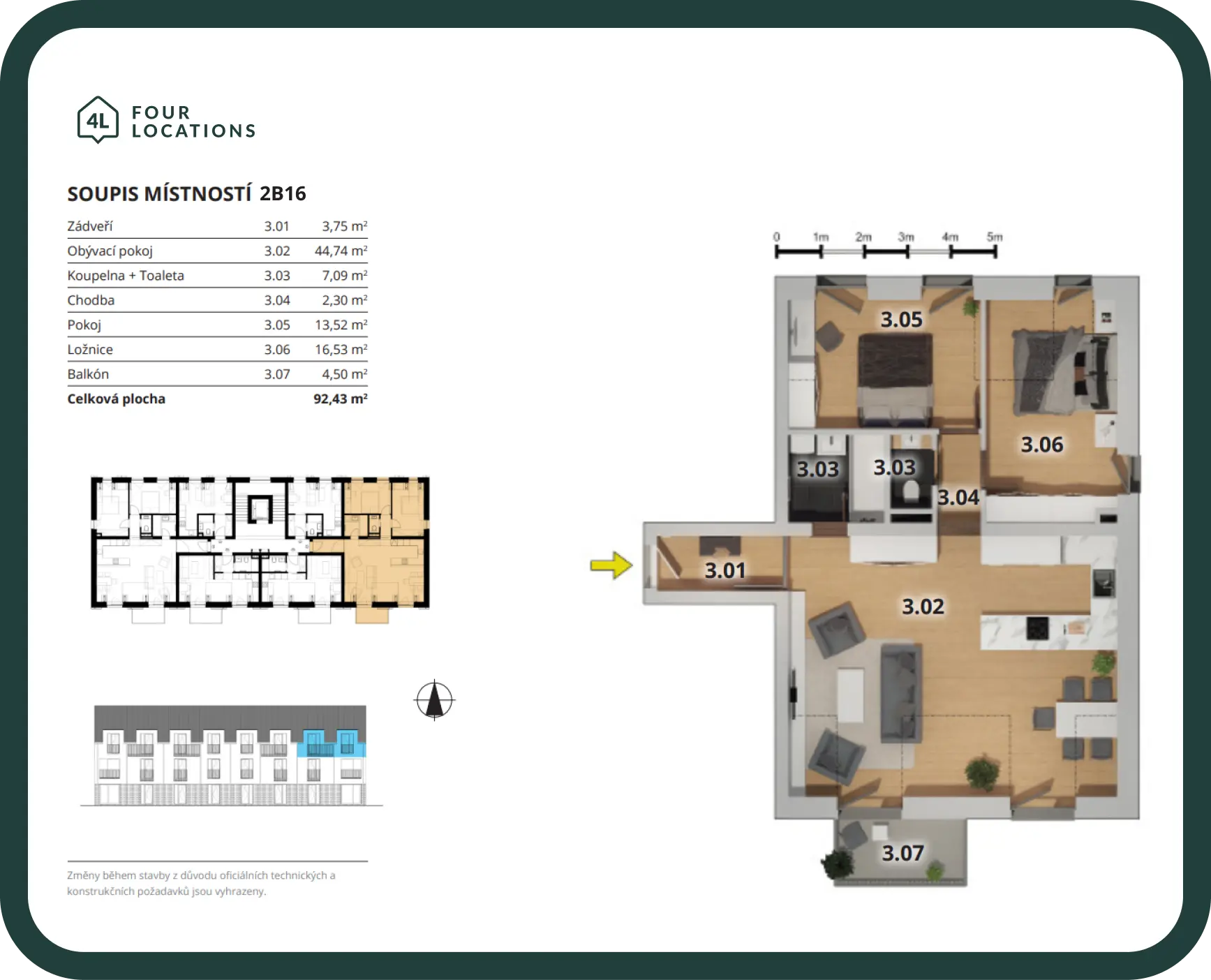 Byt 2B16 má balkon o velikosti 4,5 m2.