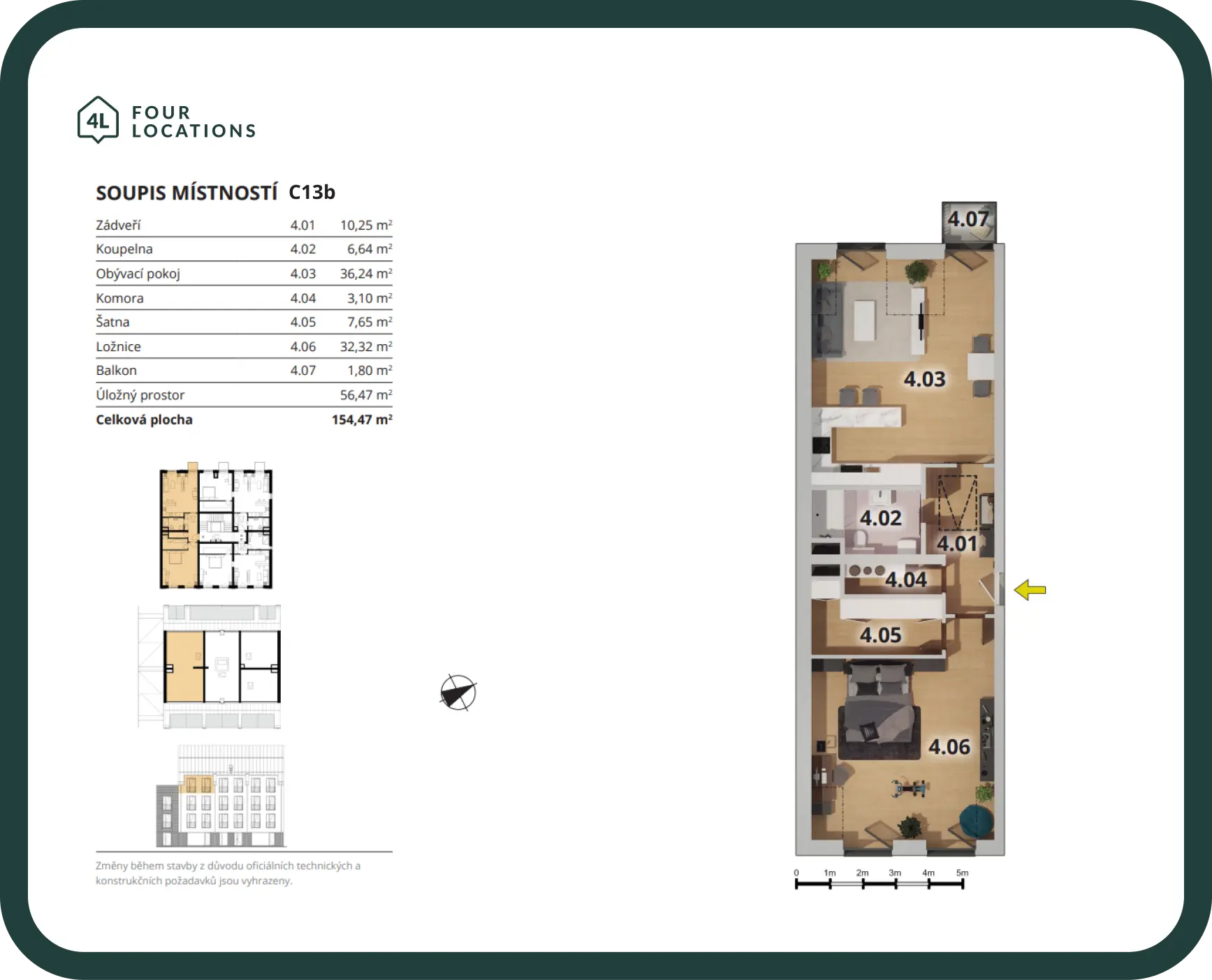 Byt disponuje parkovacím stáním a balkonem o velikosti 1,8 m2 a úložným prostorem o velikosti 56,47 m2