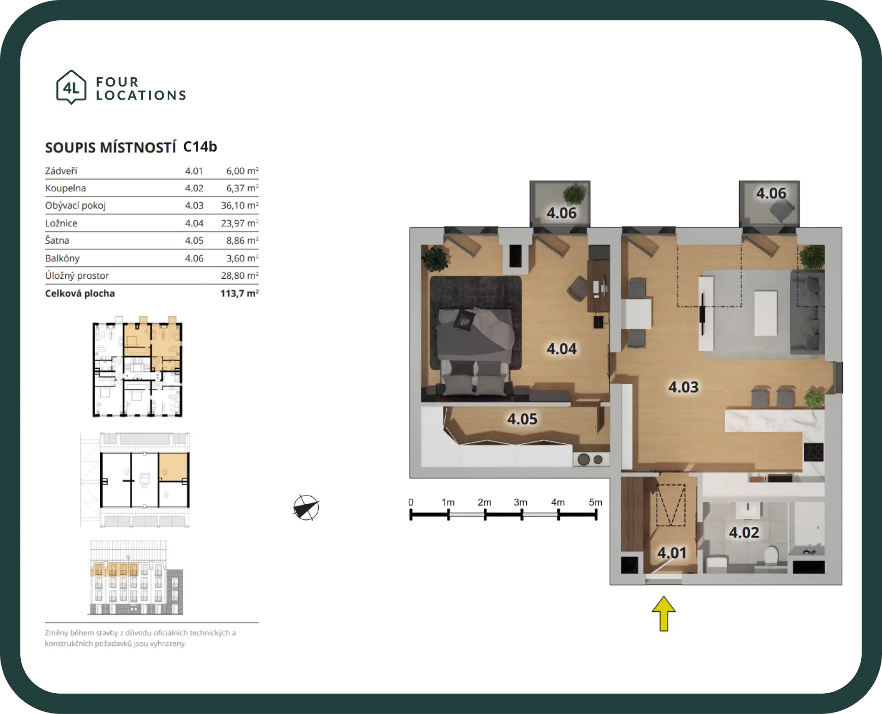 Byt disponuje balkonem o velikosti 3,6 m2 a úložným prostorem o velikosti 28,8 m2